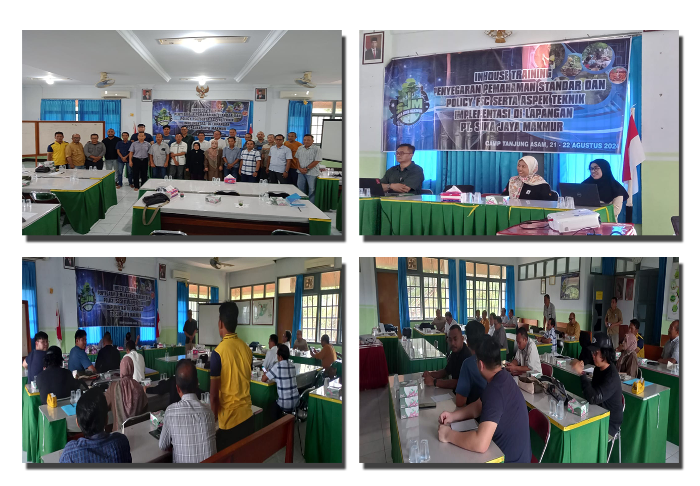 Inhouse training ini meliputi : Ketenagakerjaan, Kesehatan dan Keselamatan Kerja, Pengelolaan dan Penanganan Limbah B3, PUHH (CoC), Pemanenan Berbasis RIL, Pembinaan Hutan dan Lingkungan, dll. Inhouse training ini mendapat tanggapan positif dari karyawan serta antusias karyawan yang mengikuti kegiatan tersebut, dengan diadakan kegiatan tersebut sehingga pelaksanaan kerja di PT. Suka Jaya Makmur dapat berpedoman pada standar dan policy FSC.